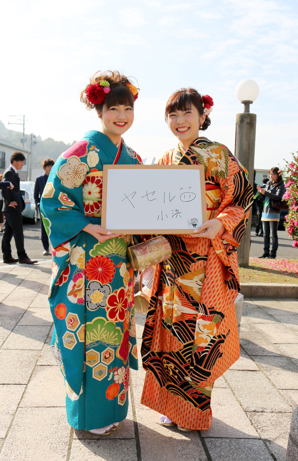 小浜町の新成人。「ヤセル」笑顔が素敵な2人組。痩せなくてもすごくお綺麗です。着物の色と柄がよく晴れています。