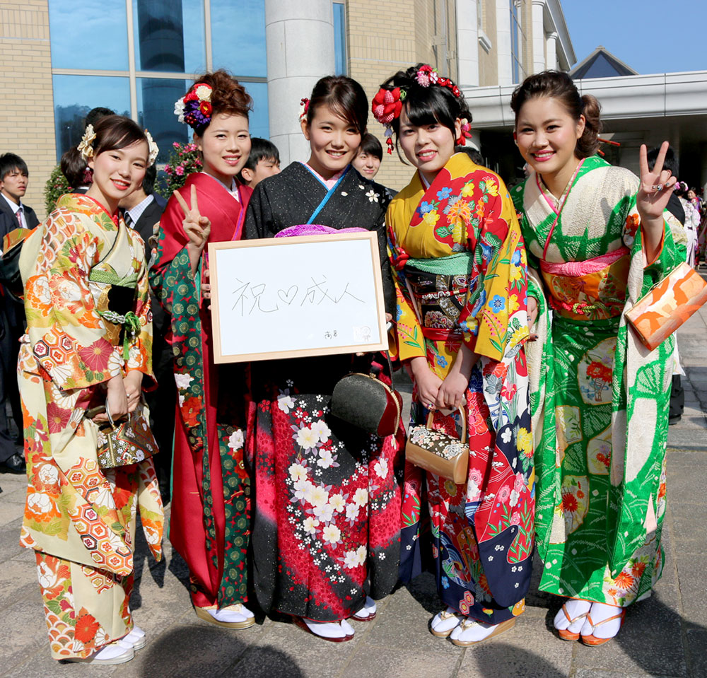 南串山町の新成人。「祝♡成人」おめでとうございます。色とりどりの振り袖がばっちりお似合いです。以上、希望いっぱいの門出を迎えた雲仙市の新成人たちでした。