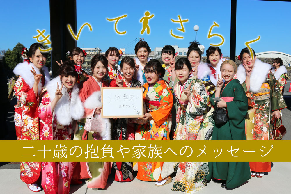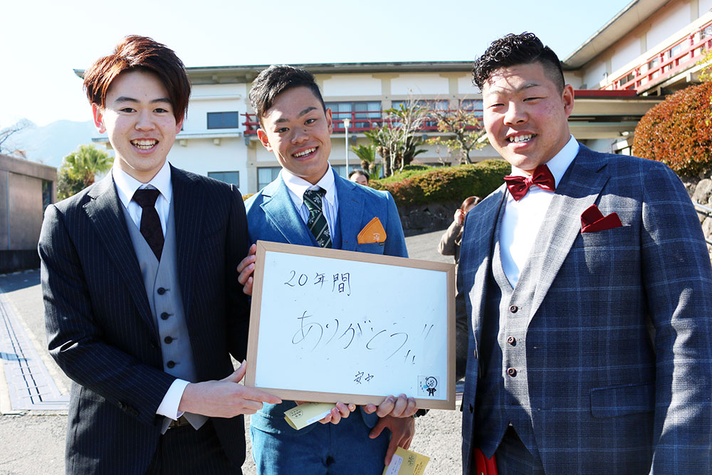三会地区の新成人。「20年間ありがとう。ありがとう。ありがとう。」家族へ思いを込めたメッセージが伝わってきます。