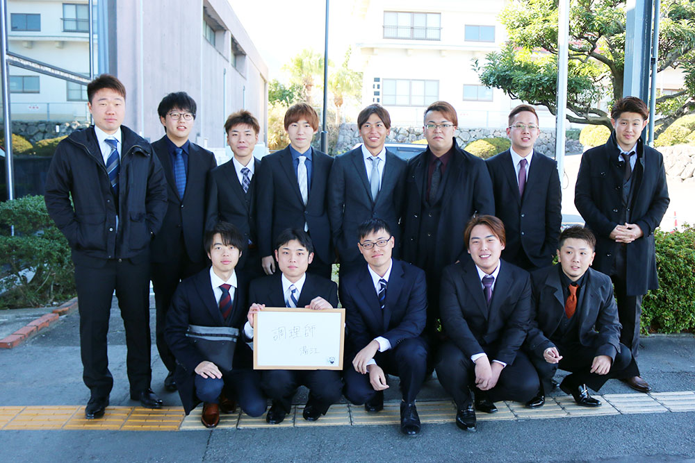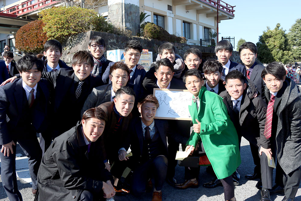 有明町湯江地区の新成人。「調理師」夢に向かってエイエイオー!みなさんカッコイイスーツがお似合いです。