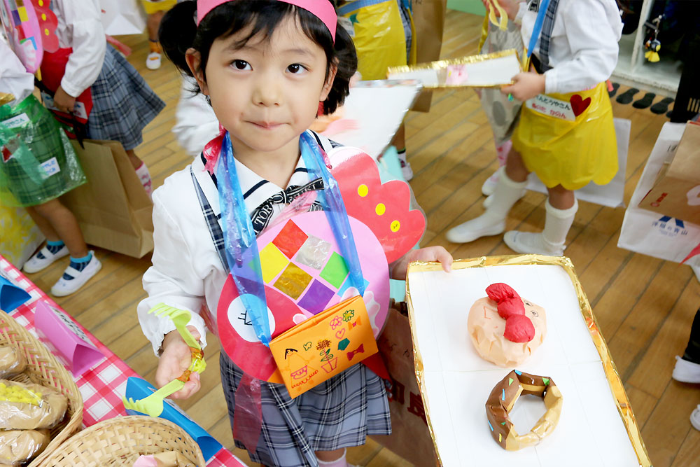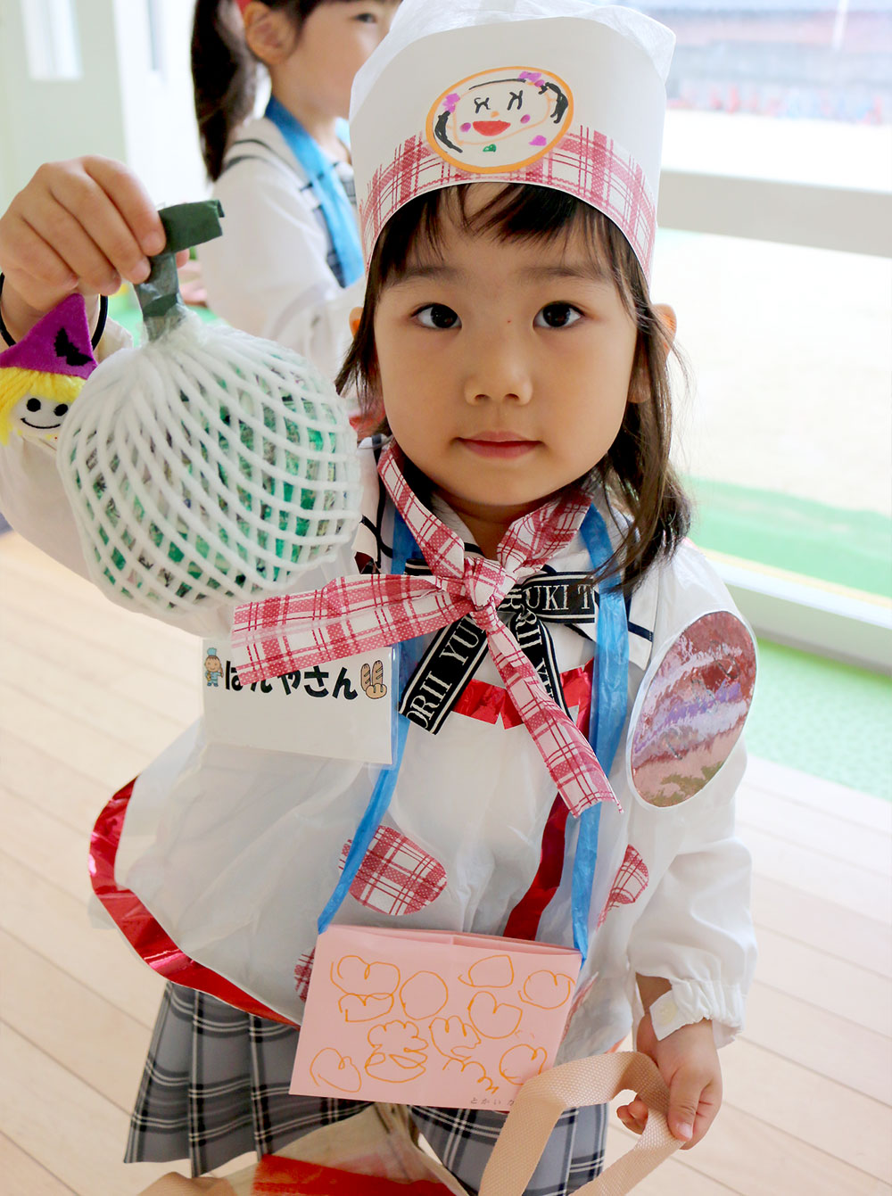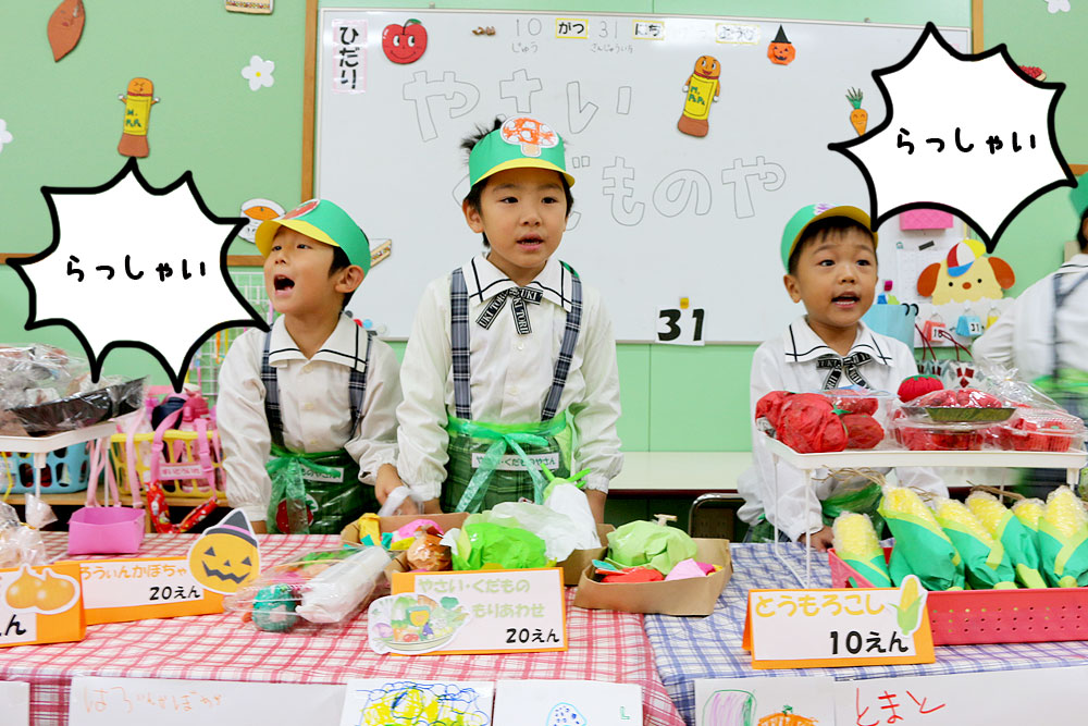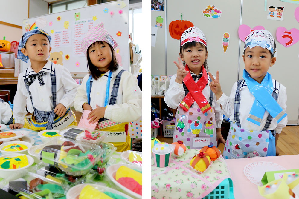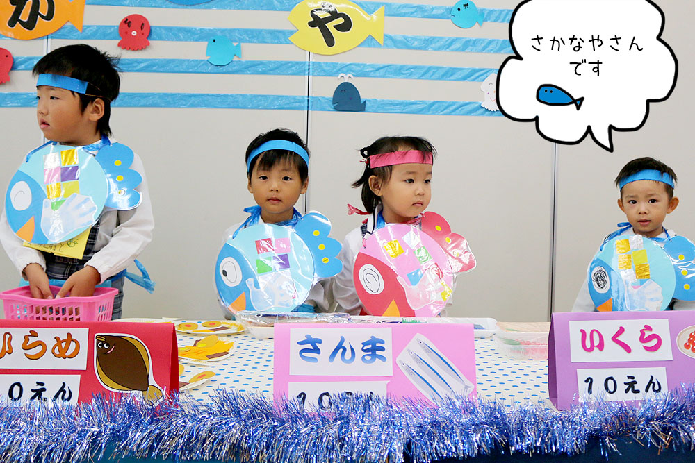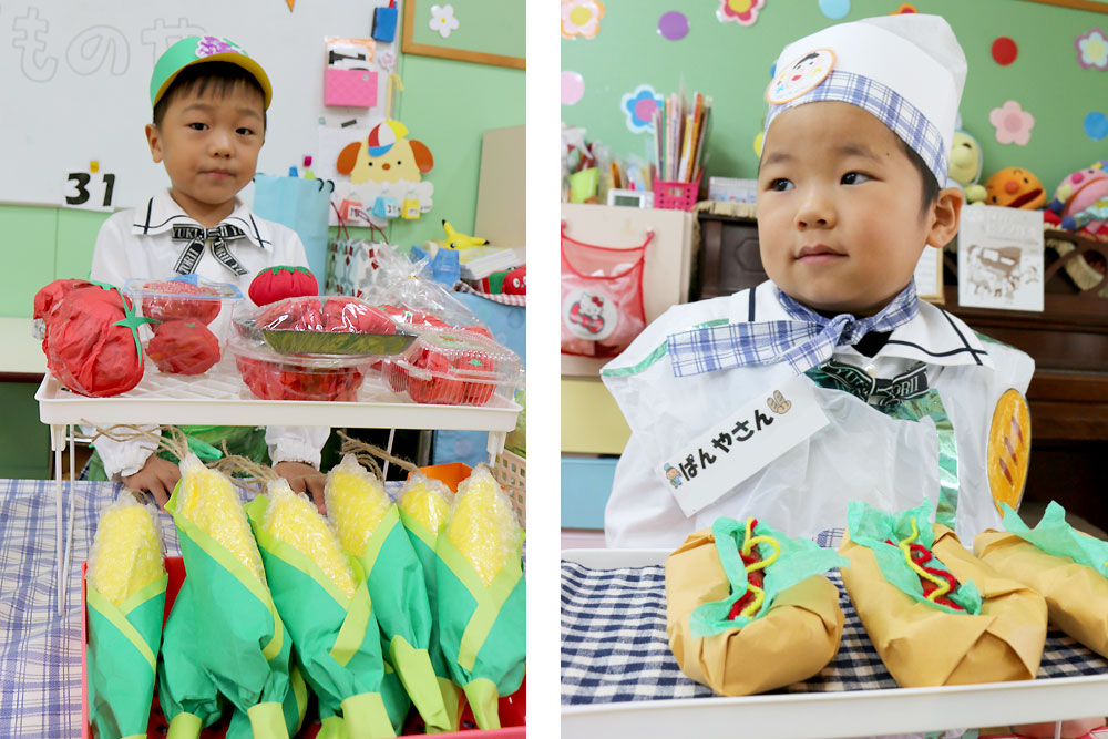 パンやさん、おかしやさん、おべんとうやさん、さかなやさん、やさいくだものさん、おもちゃやさんの6種類のお店を構えて、店員さんに扮した園児が商品を売り買いします。