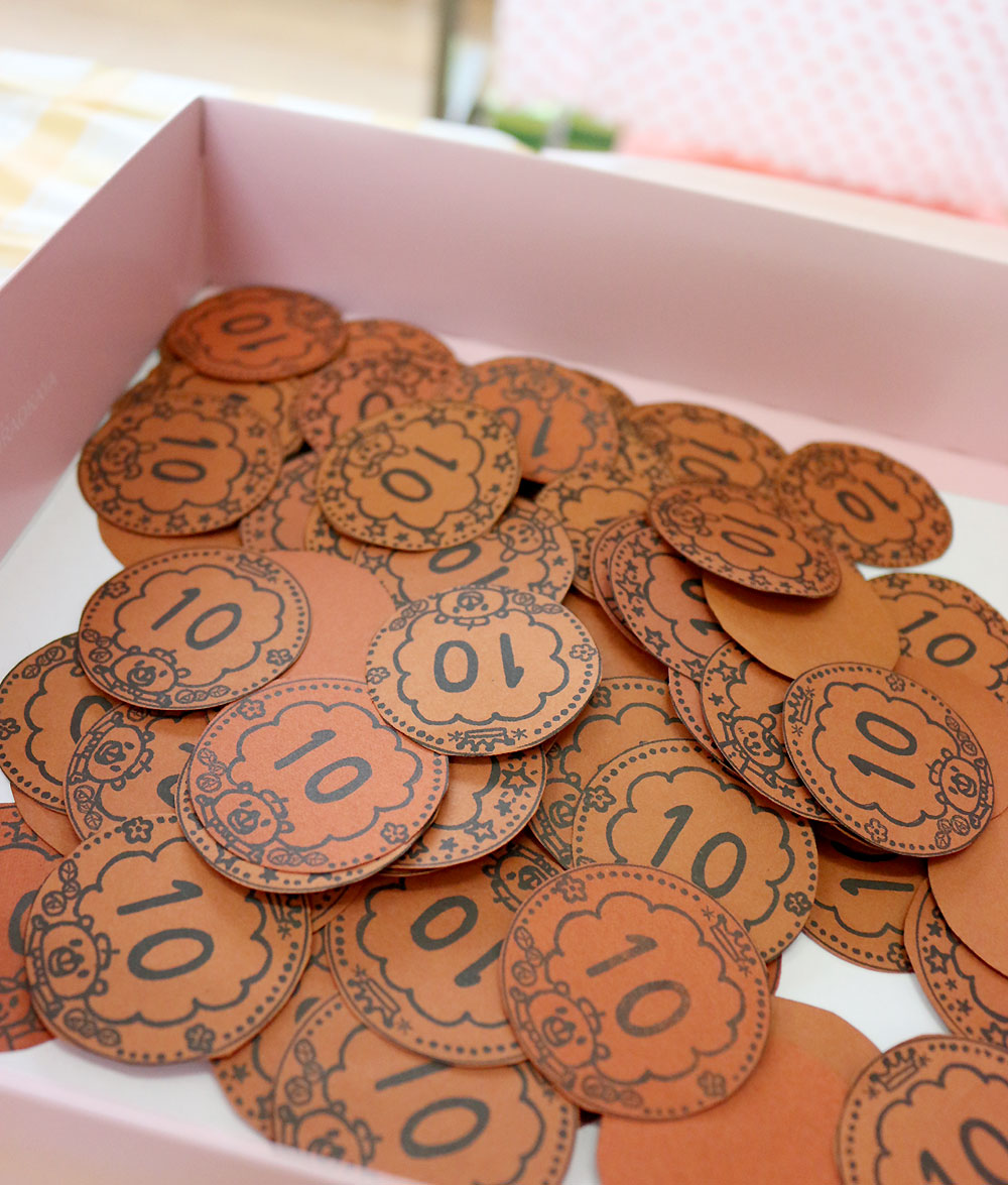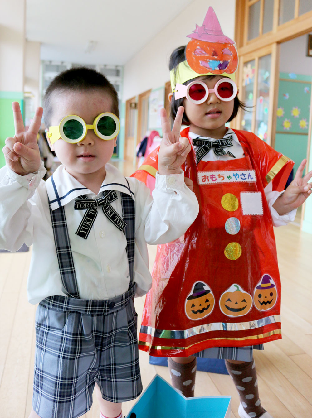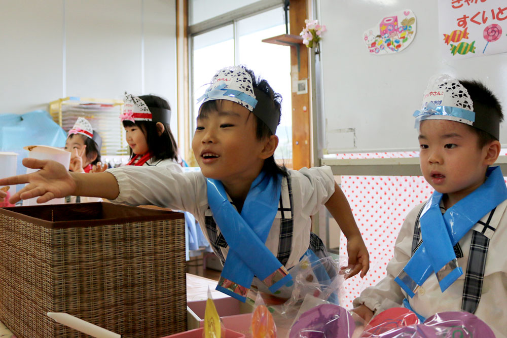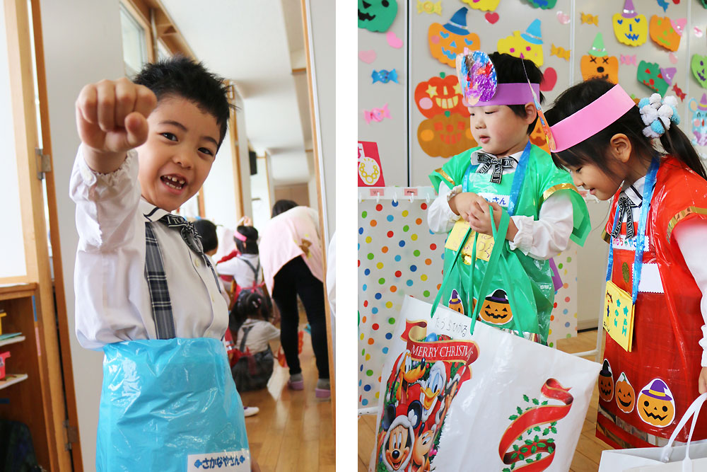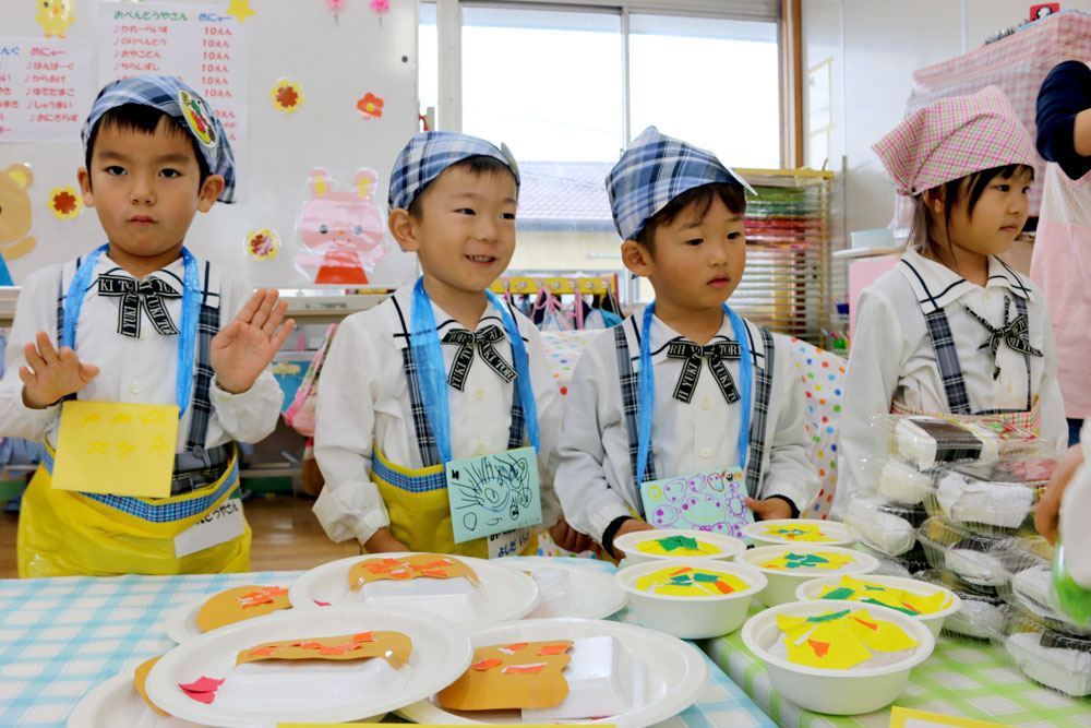 パンやさん、おかしやさん、おべんとうやさん、さかなやさん、やさいくだものさん、おもちゃやさんの6種類のお店を構えて、店員さんに扮した園児が商品を売り買いします。